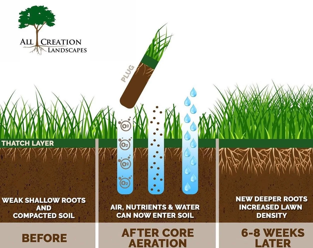 Lawn aeration breaks up compacted soil by pulling out small plugs, improving air, water, and nutrient flow to the roots.